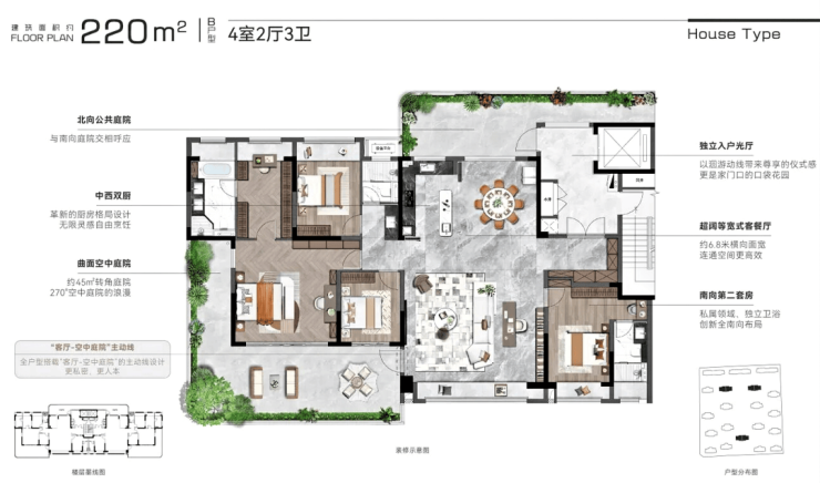 南向L型空中庭院巧妙衔接卧室,打造“厅卧同质”空间,赋予主卧更多功能性;同时,前庭后院布局,北向特赠超大公共平台,预留出无限可能的生长空间,为未来生活注入丰富多样性与不断涌现的新奇体验。