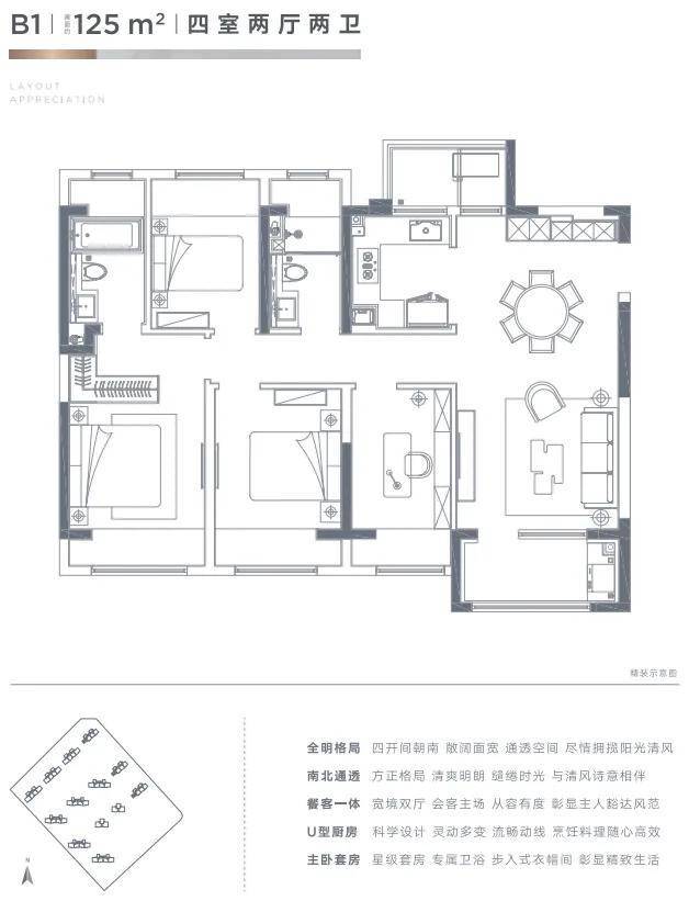 雅乐云庭建面约125㎡的四房两厅两卫户型,拥有四开间朝南的布局,南向面宽超过12米,确保了充足的阳光照射。餐客大横厅的设计,不仅使空间显得更加开阔,更方便家人之间的互动与交流。