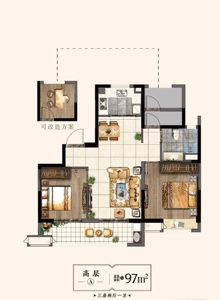 三房两厅两卫设计,三开间朝南,大阳台,较之97㎡,该户型两卫设计,并且主卧为套卧,舒适度上大大提升,适合初改客户。