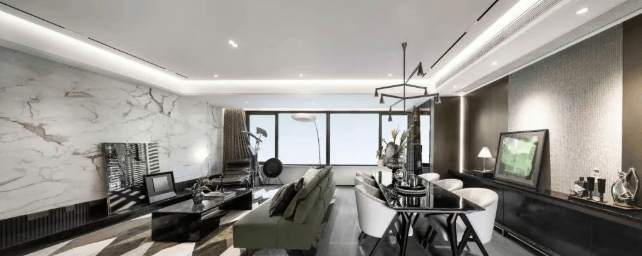 至臻品质·人性化细节:黑色不锈钢拉丝入户门套 | 厨房龙头自动感应 | 厨房台面滴水线防水保护 | 客厅悬浮吊顶无主灯设计 | 长条隐藏地漏