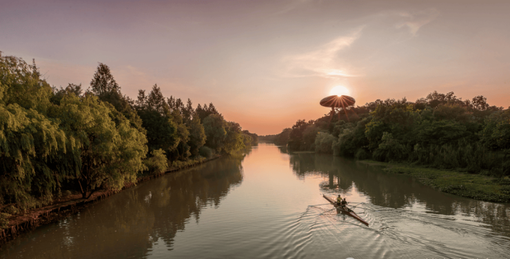 风格:融合宋代美学与现代隐奢语言,铝镁锰金属波浪屋顶、美国白金石干挂立面、全景落地窗,270°环景引湿地入室