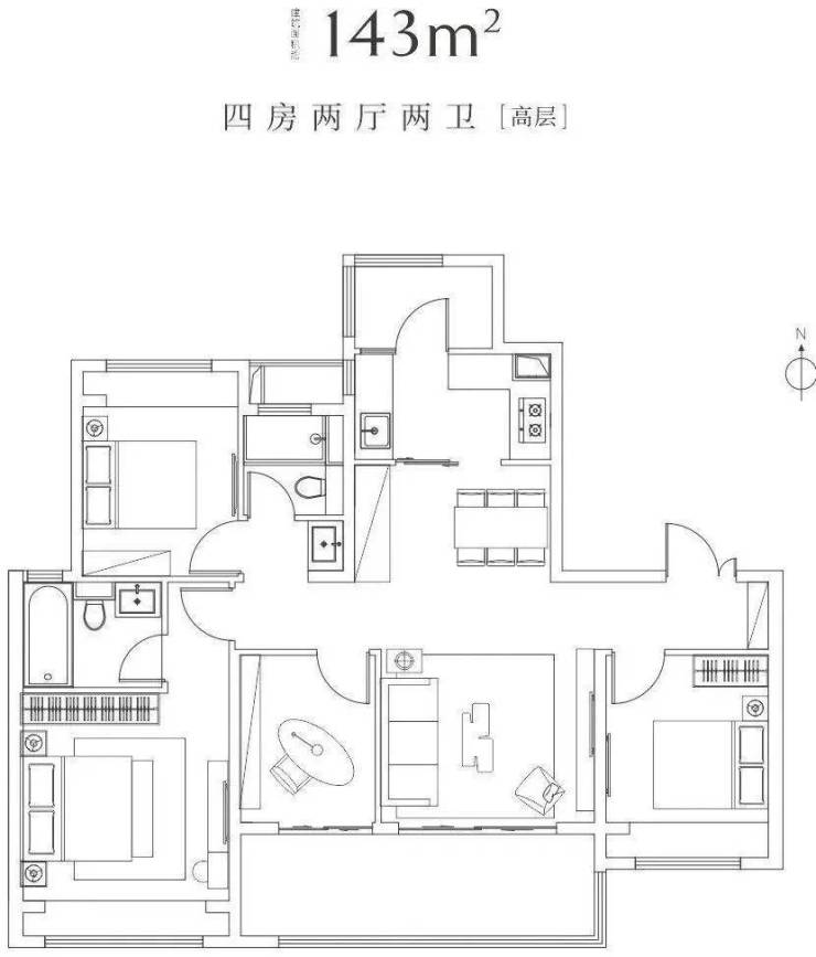 ‌主力户型‌:高层建面约143㎡三房,洋房建面约165㎡四房,得房率高层76%、洋房84%,配置6.2米双联阳台及LDKB一体化客厅设计