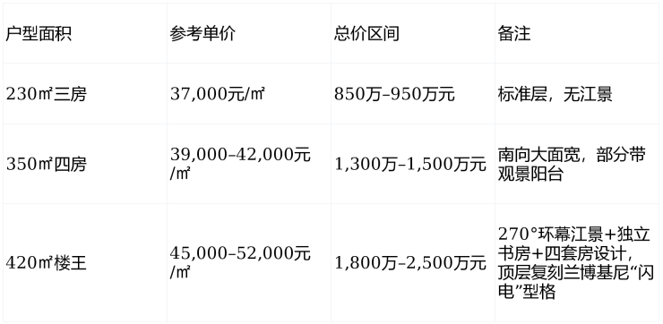 主力产品为建面230–420㎡精装行政大平层,层高3.7–4.5米(行业最高标准),得房率88%–93%,采用1.8万元/㎡国际精装标准,甄选: