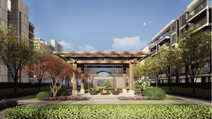建筑立面:沿用中国特有的江南水乡建筑风格,采用古典三段式分割比例,保留坡屋顶元素,将含蓄雅致的文人情怀融入建筑,使人入园如临江南之境,尽享诗意雅居的惬意。
