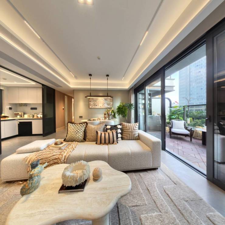 项目打造约5万方立体江南园林,融入乌篷船、苏绣等苏州文化符号,选用西班牙珊瑚红奢石、百年古树等高端材质,呈现摩登江南的现代美学