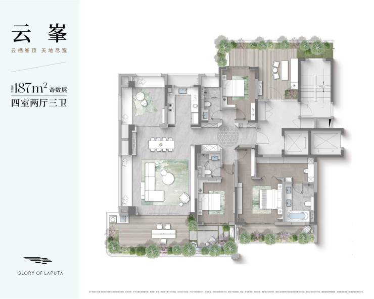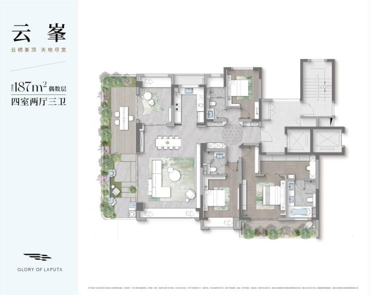 类型面积(㎡)特色亮点云逸108三室两厅两卫,得房率约95%云汀129三室两厅两卫,空间利用率高云岫146四室两厅两卫,部分户型得房率123%云峯187四室两厅三卫,顶层得房率130%