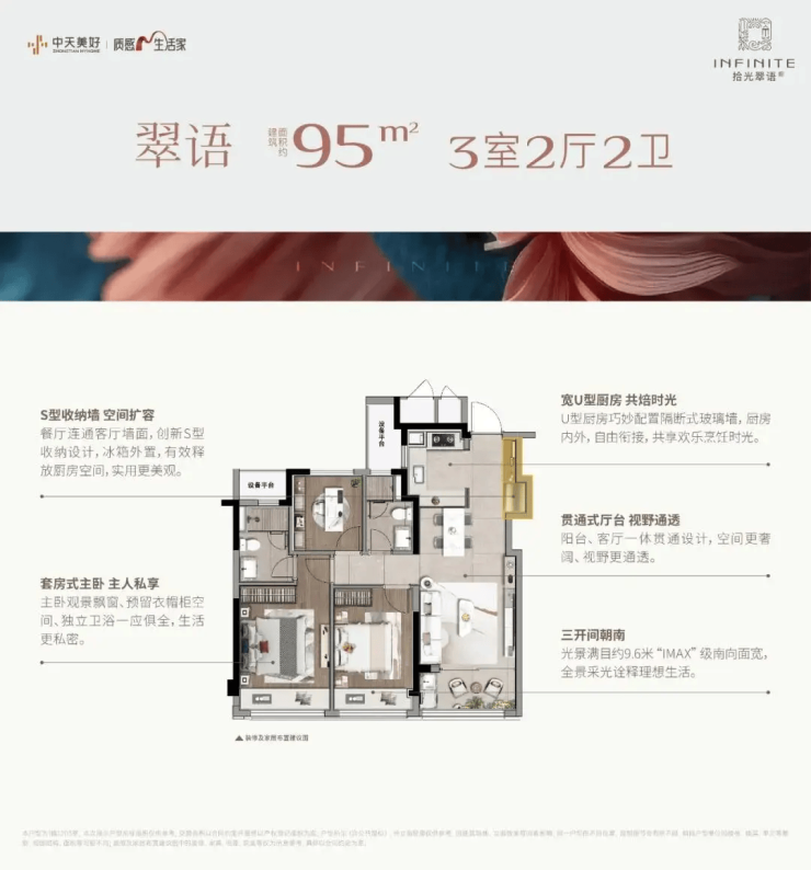 中天拾光翠语通过“阳台只计一半面积”的优势,使得每套房子使用率超90%。建面约95㎡的三房户型,实际使用面积媲美市面110㎡户型;建面约103㎡的边套户型,餐客厅与阳台一体化设计,面积达约35㎡(含阳台),媲美140㎡大宅尺度。