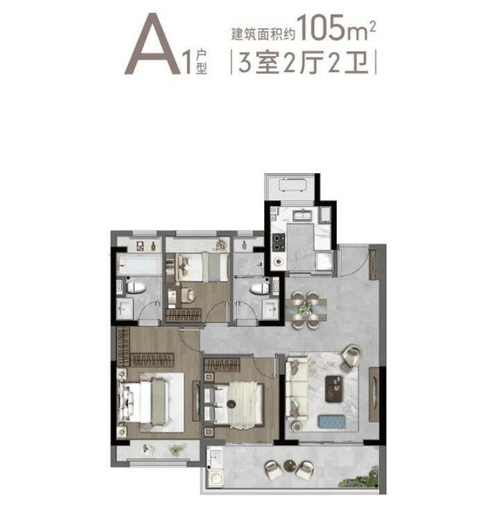 105㎡三室两厅两卫:经典竖厅设计,南向双卧+客厅三开间朝南,U型厨房连接生活阳台,总价约278万起。该户型动静分区明确,主卧套房设计,适合年轻三口之家