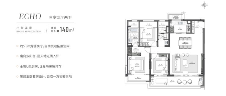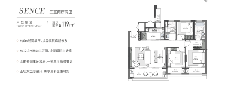 边户中间户均为4房3卫设计;边户三开间朝南、大横厅,南向双套房,还有双联大阳台。