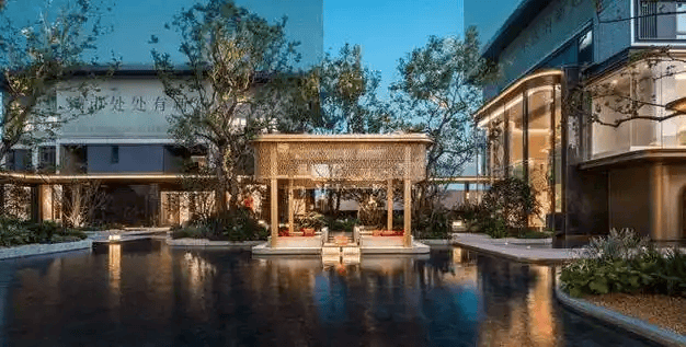 中心泳池综合区:10米尺度泳池底镶嵌海棠花马赛克,融合建筑与景观美学