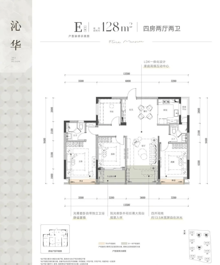128㎡四房两卫:四开间朝南+北向书房,封闭式阳台