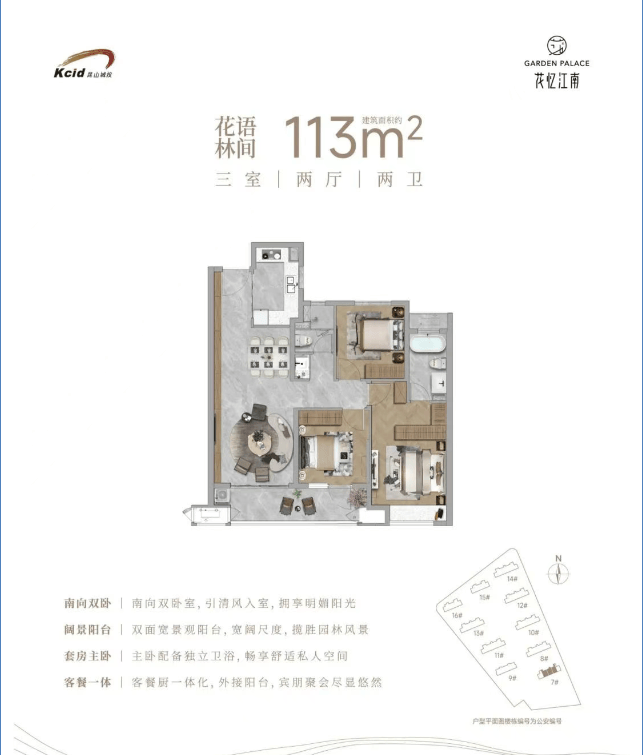 113㎡三居室:三室两厅一卫,南向双阳台,总价约203万-237万