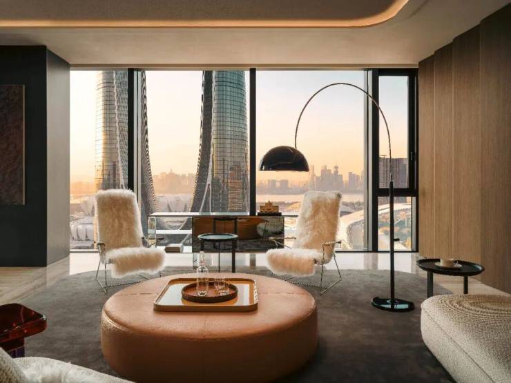 而有着同样优雅弧度的Maxalto Lilum米白色沙发,围合出慵懒安然的观景位,搭配一旁B&B Italia的J.J.单椅,金属的利落与羊毛的柔软温暖相拥,便有了或自在对谈、或看尽城市天际的悠然。