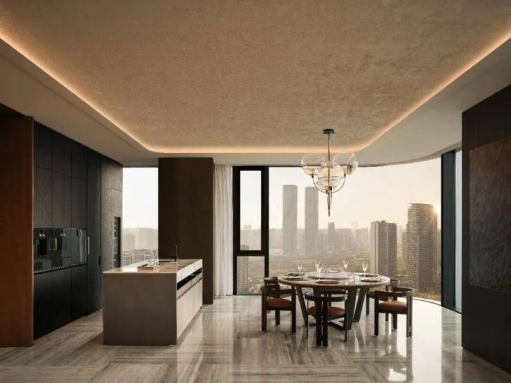 很多时候,设计不是为了创造时尚,而是在创造一种背景,让生活自然地展开。就像安于客厅一侧的餐厅,通透转角中拥揽城市地标的尊崇,一圆一弧间,是家的融合满足。