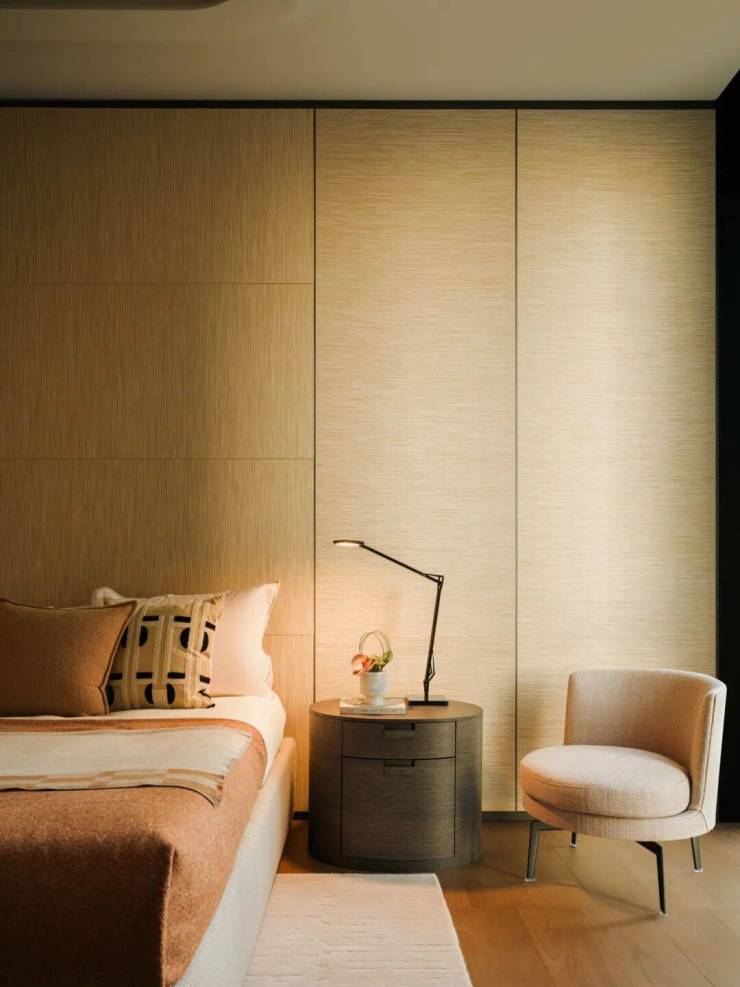 牛皮编织床架触感细腻,加上Ginger单椅点缀其中。地面通铺欧洲红樱桃木地板,加厚的实木面层为进口定制,鲜见的铺贴方式亦为Antonio Citterio特别设计,面层会随着时间温润变色,与岁月同长。