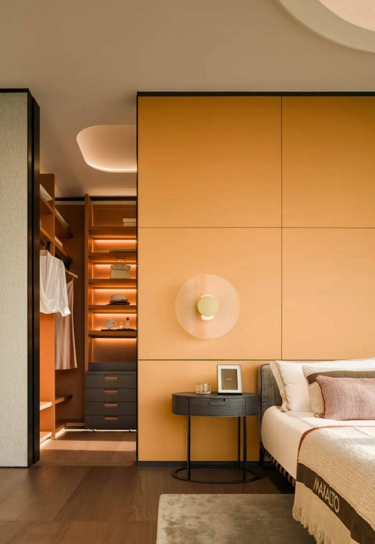 顺洄游动线绕行,是令人心动的B&B Italia Backstage衣帽间,层板与踢脚线的内嵌灯带会在开启时点亮,橙灰色调与牛皮结合,营造出如爱马仕展厅般的高级感。开放式设计让衣物一目了然,穿搭都成为一种仪式。