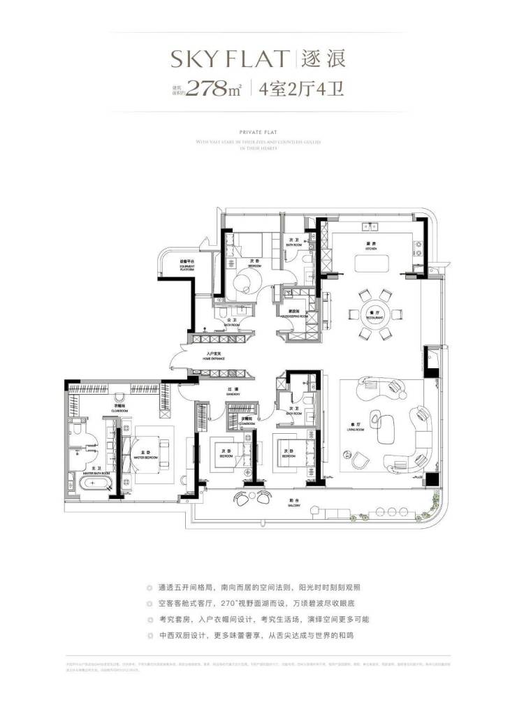 另外,该户型还为双套房设计,所有主卧、次卧均有独立卫浴。超大景观阳台连通客厅与卧室,使得无论哪个空间都能欣赏窗外的风景。