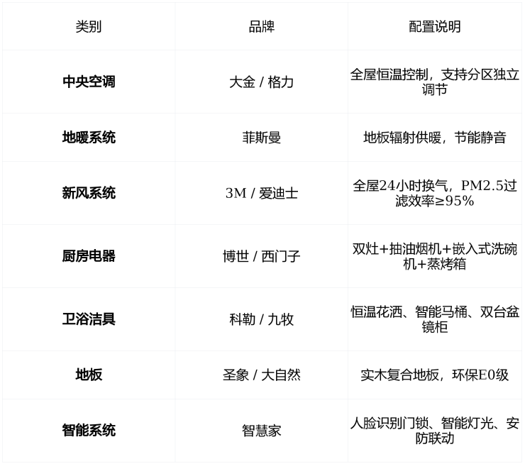 精装标准全屋精装交付标配三大件:中央空调 + 地暖 + 新风系统厨卫采用一线品牌智能门锁 + LED照明 + 静音门窗装标超2000元/㎡