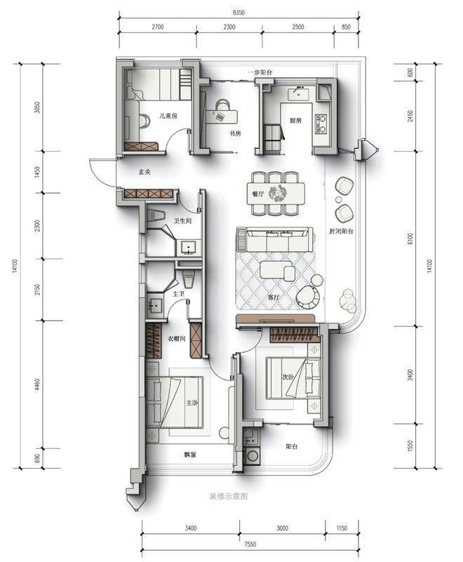 起步约94方户型也很能「打」—三开间朝南,南向开间将近10米,客厅连通了进深约1米5的大阳台。仔细看,玄关边还预留了一处「深U空间」,俗称S墙,可以塞下双开门冰箱,完美解决小户型冰箱的放置问题。