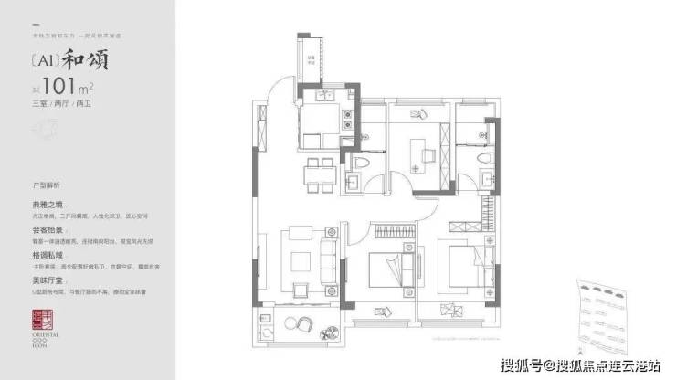 101㎡ 三室两厅两卫,经典的小三房,胜在两卫设计,功能性很齐全,但面积注定了空间尺寸,餐厅会稍显拥挤。