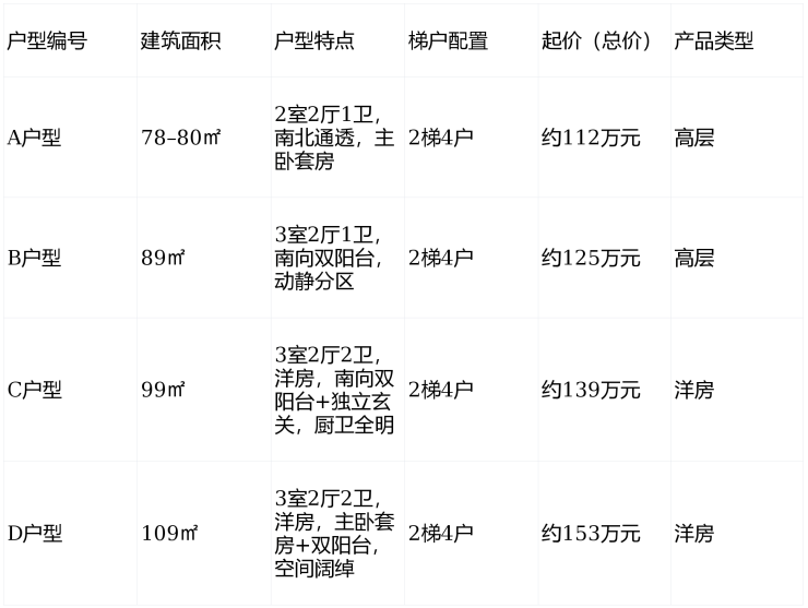 主力户型:78㎡–109㎡,全明格局,双阳台设计,主卧套房配置