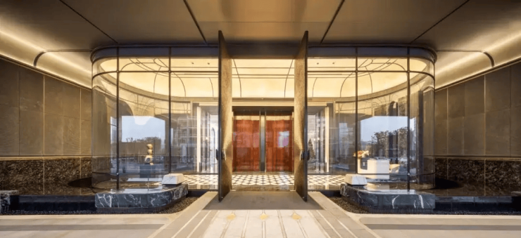 外立面采用香槟金与深灰双色铝板幕墙 + 圆弧热弯玻璃,灵感源自破浪游艇,打造360°流线型天际线