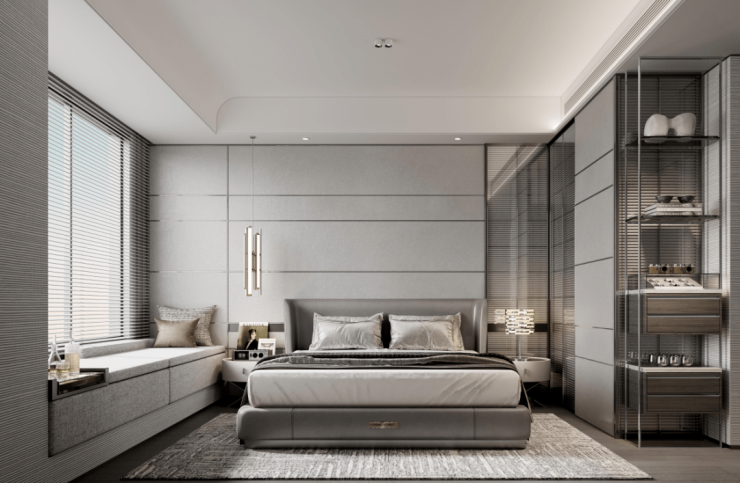 以建筑面积约143㎡四房为例,约15㎡星级套房主卧,皮质背景墙,具有强贴附性、拉伸性和可塑性,更加细腻柔软亲肤,可柔化空间氛围、吸音降噪、恒温保暖,并且安全舒适、易于保养。