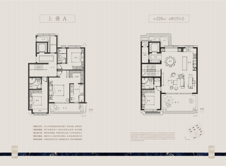 220㎡ 上叠 1119 – 1200万 ; 北向露台+4楼超大露台,观湖视野极佳
