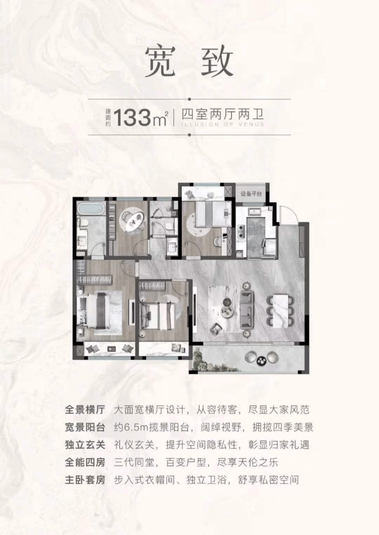 133㎡四室两厅两卫:总价约220–230万元,LDKG一体化设计,双阳台通透布局