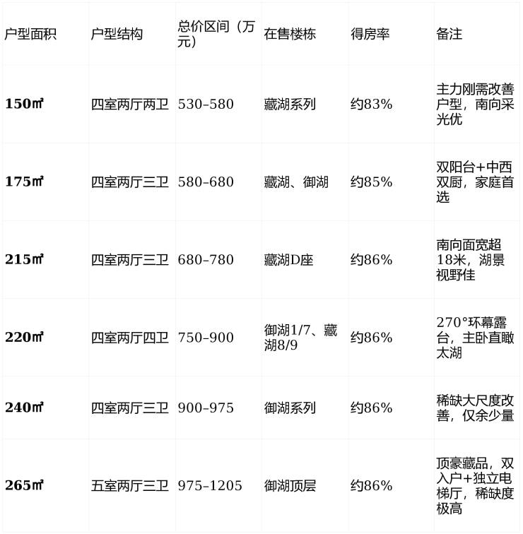 ✅ 购房建议 :220㎡以上湖景朝向房源已进入最后认购期,建议优先锁定 南向+露台无遮挡 户型,265㎡顶豪仅剩3席,可预约专属看房通道。