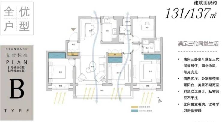 三房设计,三开间朝南,南北通透;