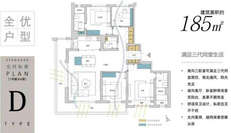 建面约185㎡四房两厅三卫: