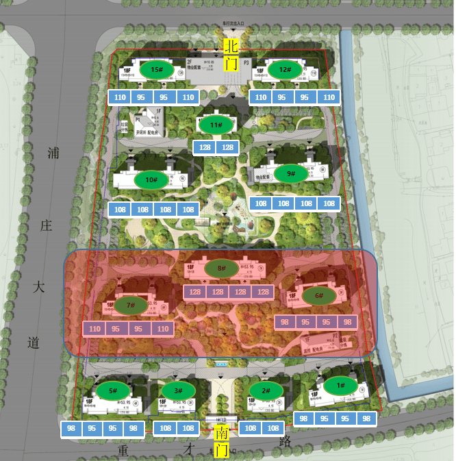 主力户型 :建面约 95–128㎡ 的三房产品,涵盖95㎡(三室两厅一卫)、108㎡、109㎡、128㎡(三室两厅两卫)等,户型方正、南北通透、全明格局。