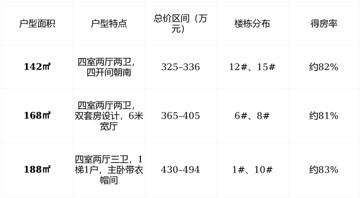 ✅ 温馨提示 :188㎡1梯1户户型为稀缺资源,剩余房源以中高楼层为主,建议优先锁定南向、低楼层户型。