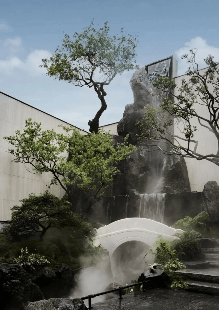 门外碧波荡漾,锦鲤嬉戏其间;拱桥巧妙复刻网师园“引静桥”之韵,三步过涧,步移景异。150吨巨石精心堆叠,造就8米高龙门叠瀑,气势恢宏;其间“鲤鱼石”灵动欲飞,仿佛跃过山峦,尽揽无限风光。