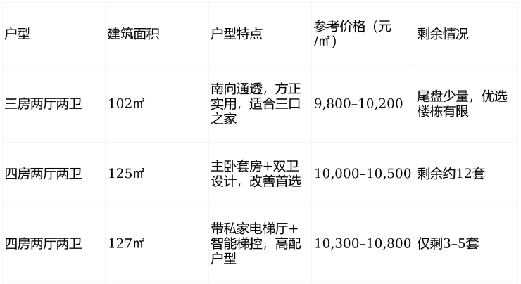 在售户型:主力为102㎡三房、125–127㎡四房,均价约10,000元/㎡