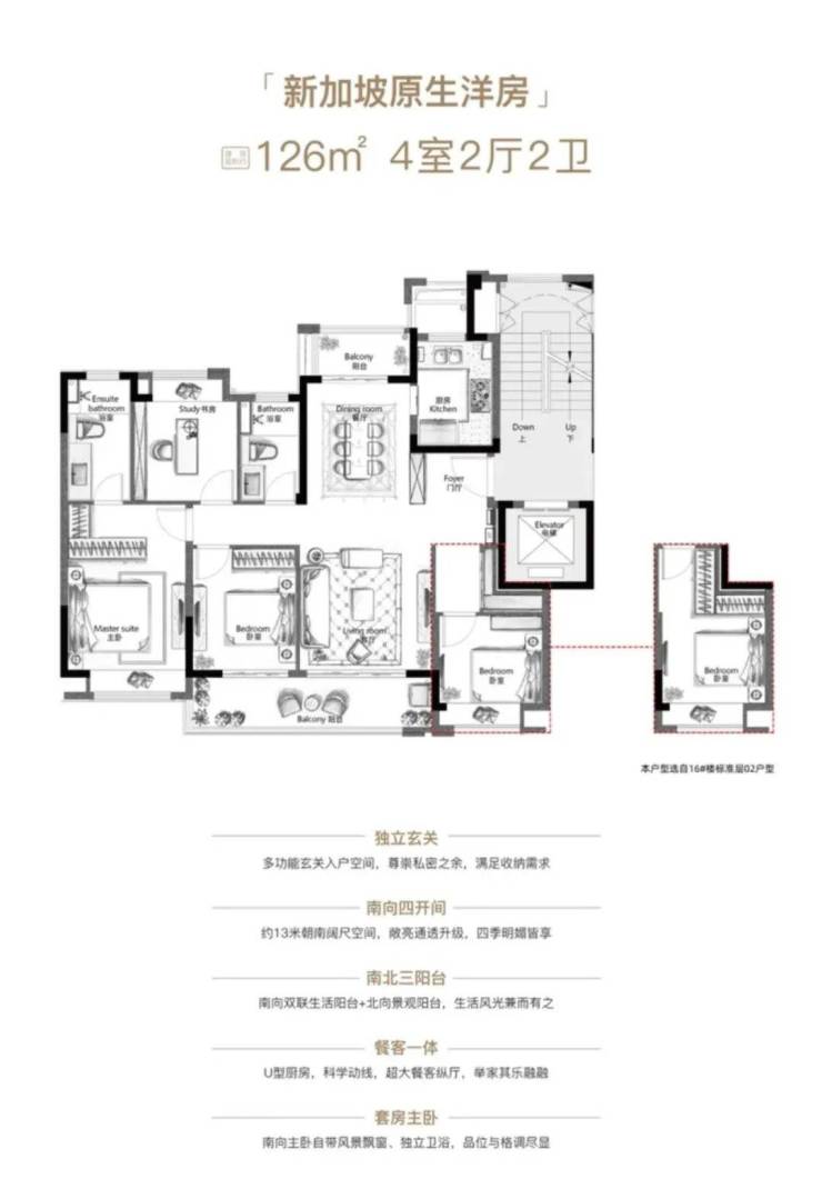 更令人惊艳的是洋房建面约126㎡、135㎡户型,堪称一见倾心。专属电梯厅设计,出电梯即入户,确保归家私密性与尊贵感。