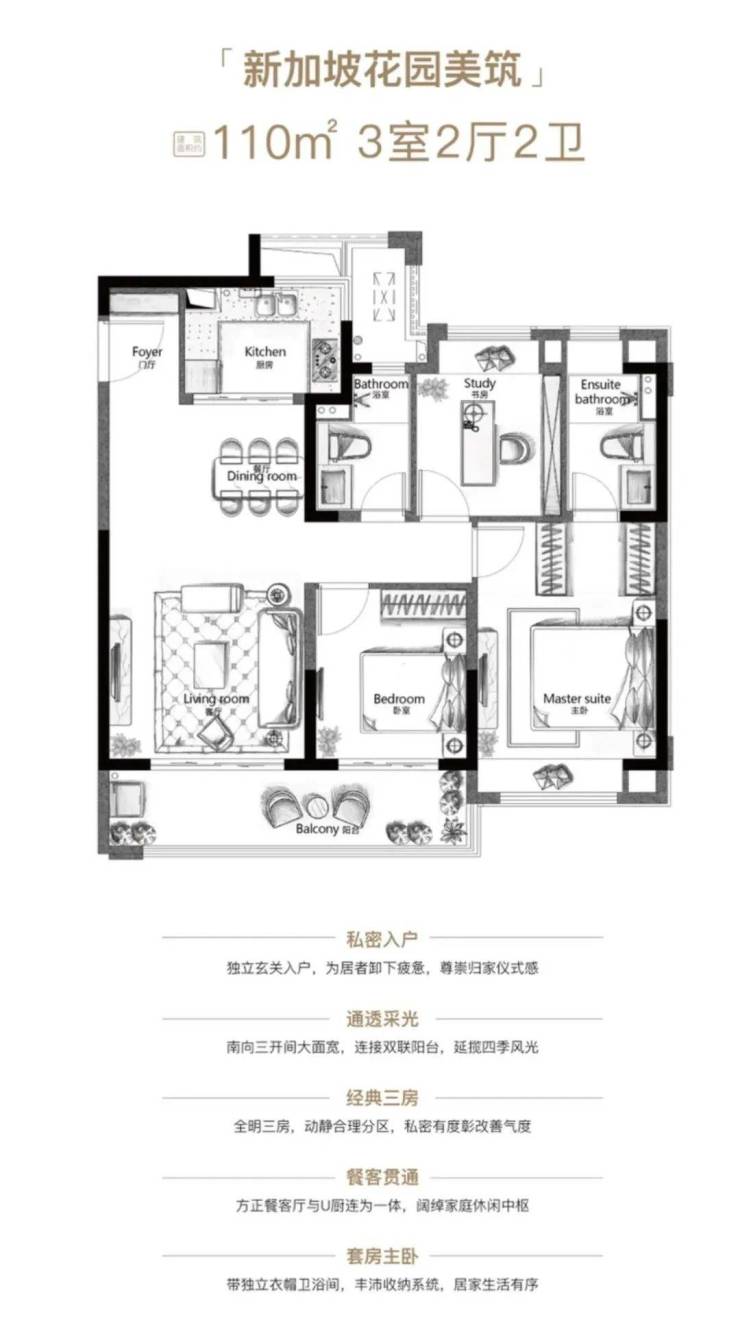 110㎡三房两厅两卫户型,在继承95㎡户型优势基础上,增加独立玄关及收纳空间,主卧配置步入式衣帽间,进一步提升居住品质。