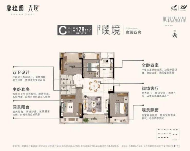 设计强调南北通透、全明户型,并突出顶层和底层的视野与居住品质优势(如观景阳台、低噪音环境);