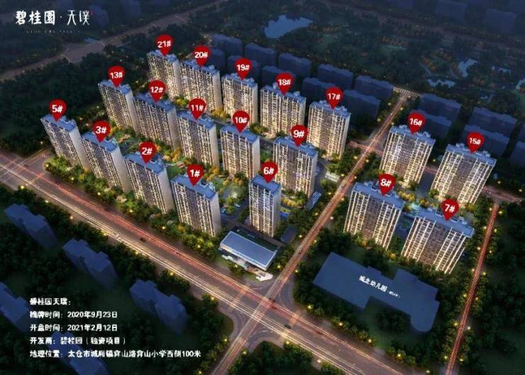 位置与项目状态:位于太仓市城厢镇弇山西路112号,属于城厢城区核心地段,邻近规划中的苏锡常城际铁路城厢站及弇山小学;项目为在售期房,由碧桂园集团开发,定位为品牌地产的高端住宅区