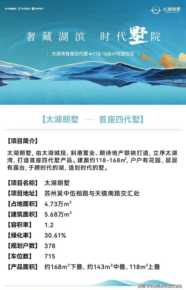 太湖朗墅由太湖城投、斜港置业、朗诗地产联合开发,位于苏州吴中区香山街道伍相路北、姚舍路东,毗邻太湖湾。项目占地约4.73万㎡,总建面5.68万㎡,容积率仅1.2(板块最低),绿化率30.61%,规划24栋6层纯叠墅,共378户,车位配比达1:1.89(715个)。物业为朗诗物业,物业费2.93元/㎡·月,毛坯交付,预计2026年分批交付。