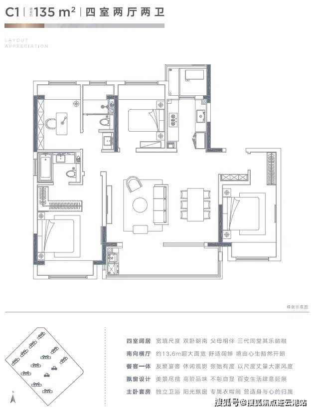 雅乐云庭建面约135㎡的超尺度四房户型,采用两梯两户的设计,提升了居住的舒适度。双联阳台和多飘窗的设置,提供了充足的采光和通风。超大横厅的设计,不仅使空间显得更加开阔,更方便家人之间的互动与交流。