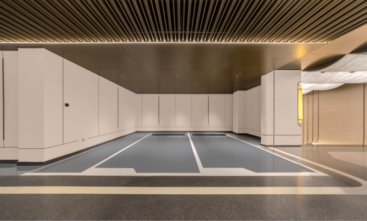 地库空间,全部采用全铝板吊顶与水磨石车道,在苏州是首度出现,定义豪邸基底。