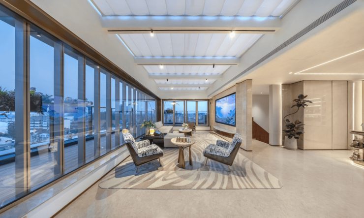 南向与侧向的双面IMAX巨幕落地玻璃窗,北向厨房亦大面积窗景,最终实现了270°环幕三面观景的殿堂级体验。
