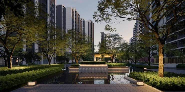 建筑西立面和阳台上方檐口用木纹铝板勾勒出古城屋檐的轻盈剪影,在复刻的「披檐」形制与花窗纹格里,触摸到传统与现代的共生密码,园林归家动线以镜面水景和几何光影演绎现代美学。正如一位业主所言:“这里不是‘占据’地段,而是让地段自然生长进生活。”