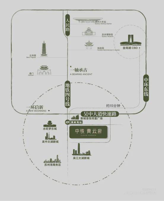 ◎发展之环:中环东接园区产经引擎,西融狮山创新脉络,南承太湖新城生态蓝图,北启高铁枢纽经济,便捷通达苏州多中心,启幕现代化城市发展新篇章。
