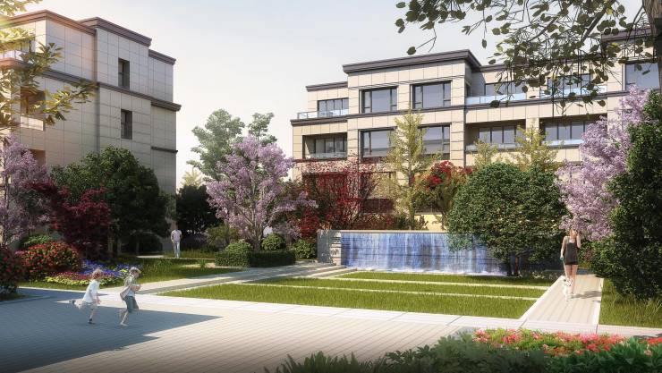 园林设计依托新渎河景观带,打造三大特色景观:贯穿社区的樱花步道、结合静水涌泉的立体水景系统以及西区规划的迎宾水景与流水景墙