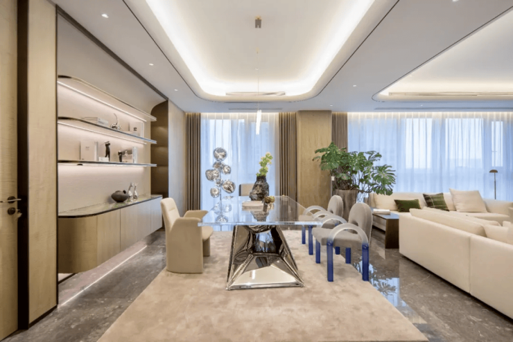 项目主打建筑面积约420㎡的大平层户型,采用一层一户、两梯一户设计,层高3.5米,得房率超95%,内部为无承重柱结构,空间布局灵活,视野开阔,配有三个阳台,可享360°环幕景观。户型为毛坯交付,水电气均为民用标准,支持通燃气,居住舒适度高 。