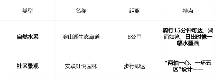 水岸步道 :600米环形慢行道, 每50米设休憩椅 , 户户通绿 |