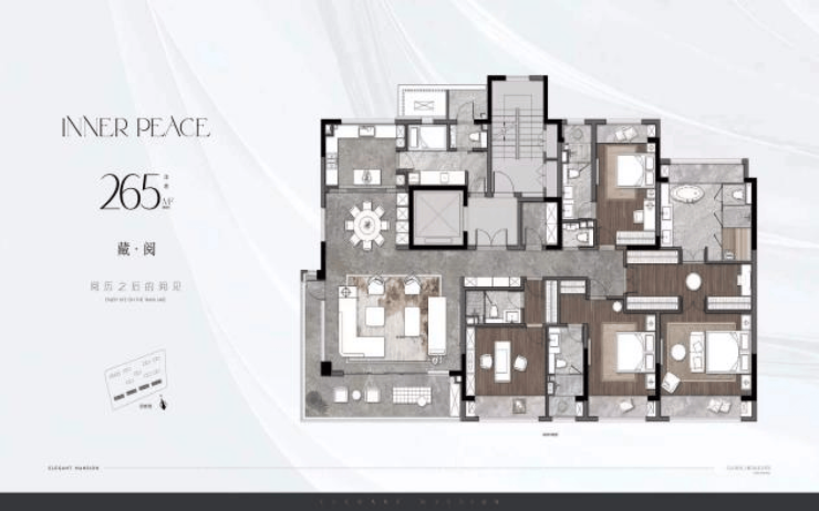 户型面积:130-265㎡,覆盖刚改至高端需求,主力户型为186㎡(4室2厅3卫)和265㎡(5室2厅5卫)
